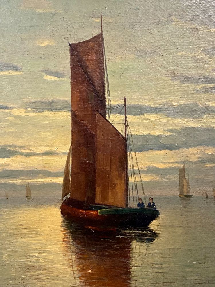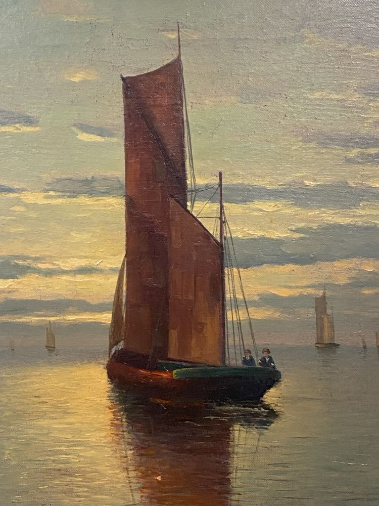 Segelschiff, original Öl-Gemälde von H. Kuhlmann (geb. 1936). Kuhlmann ist bekannt für Hamburgerhafendarstellungen, Schiffsgemälde und Seebilder. Das Gemälde wurde auf Leinwand gemalt und unten rechts von Künstler signiert. Der Rahmen wird kostenlos mitgeliefert. Maße mit Rahmen 62 x 84 cm / Ohne Rahmen 46 x 68 cm.