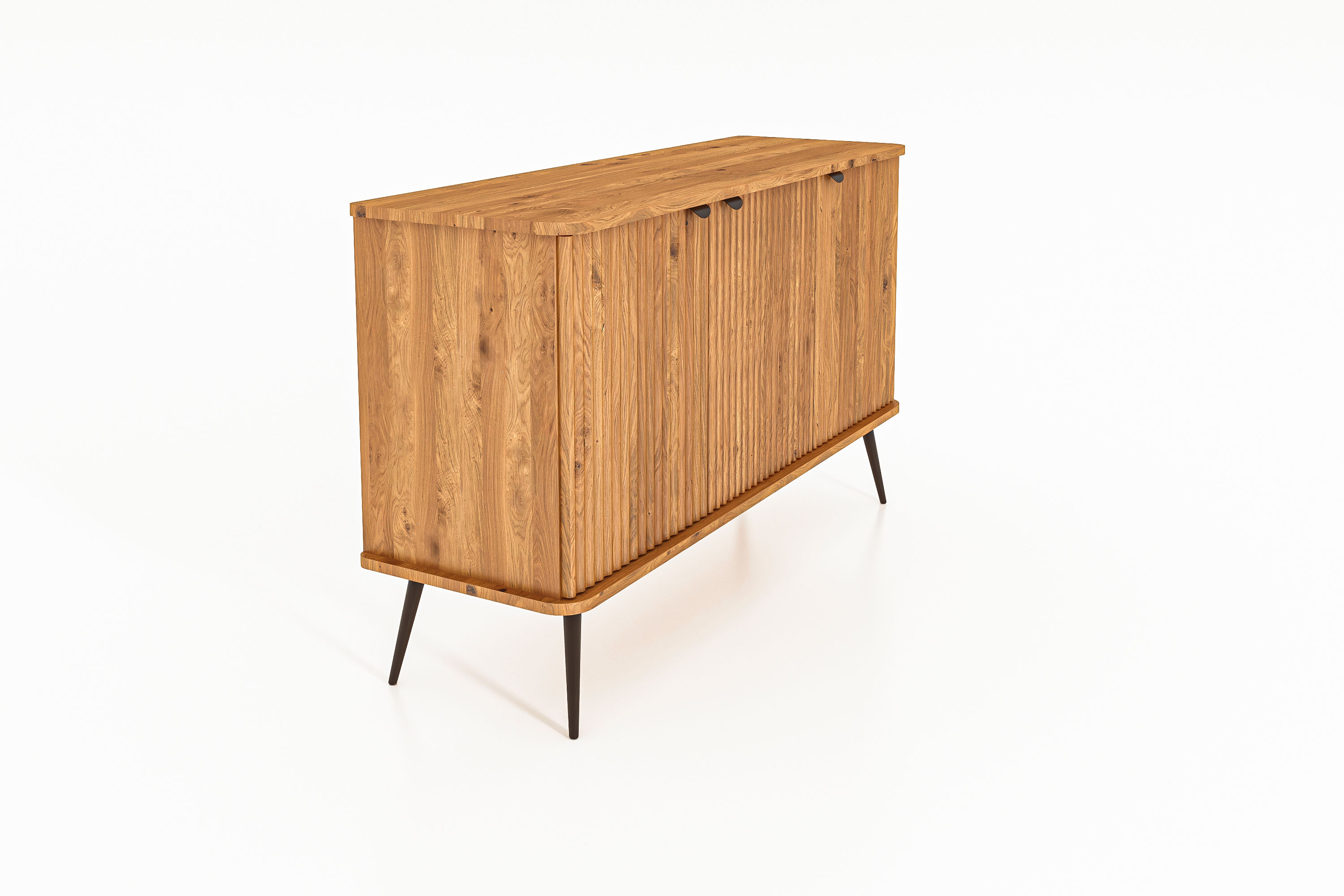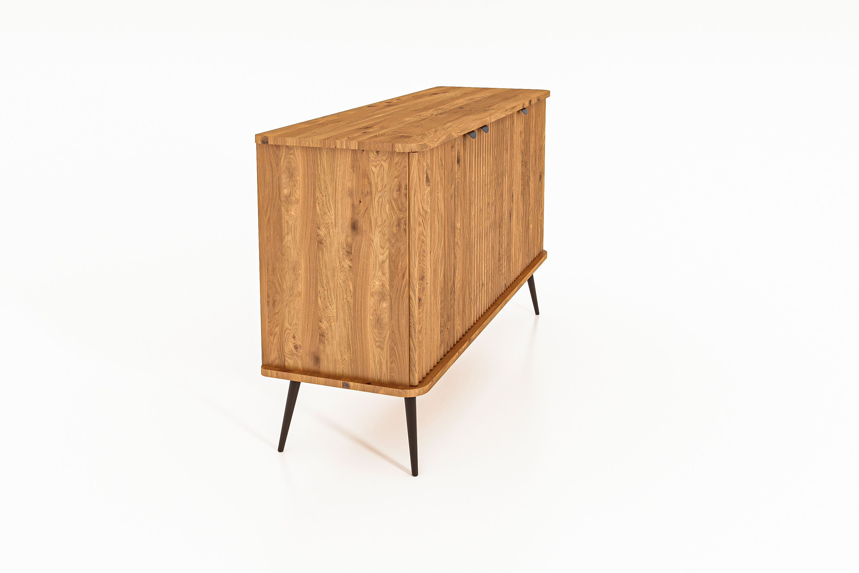 diese Anrichte Sideboard besticht, wie auch viele andere Modelle aus dieser Serie durch ihre Front. Schlichtes Design gepaart mit Handwerkskunst und einfach tollem Holz. Die Türfronten "LEBEN" durch die in das Holz gearbeiteten Rillen. Jede Blickrichtung ein anderes Holzbild. Diese Anrichte / Sideboard