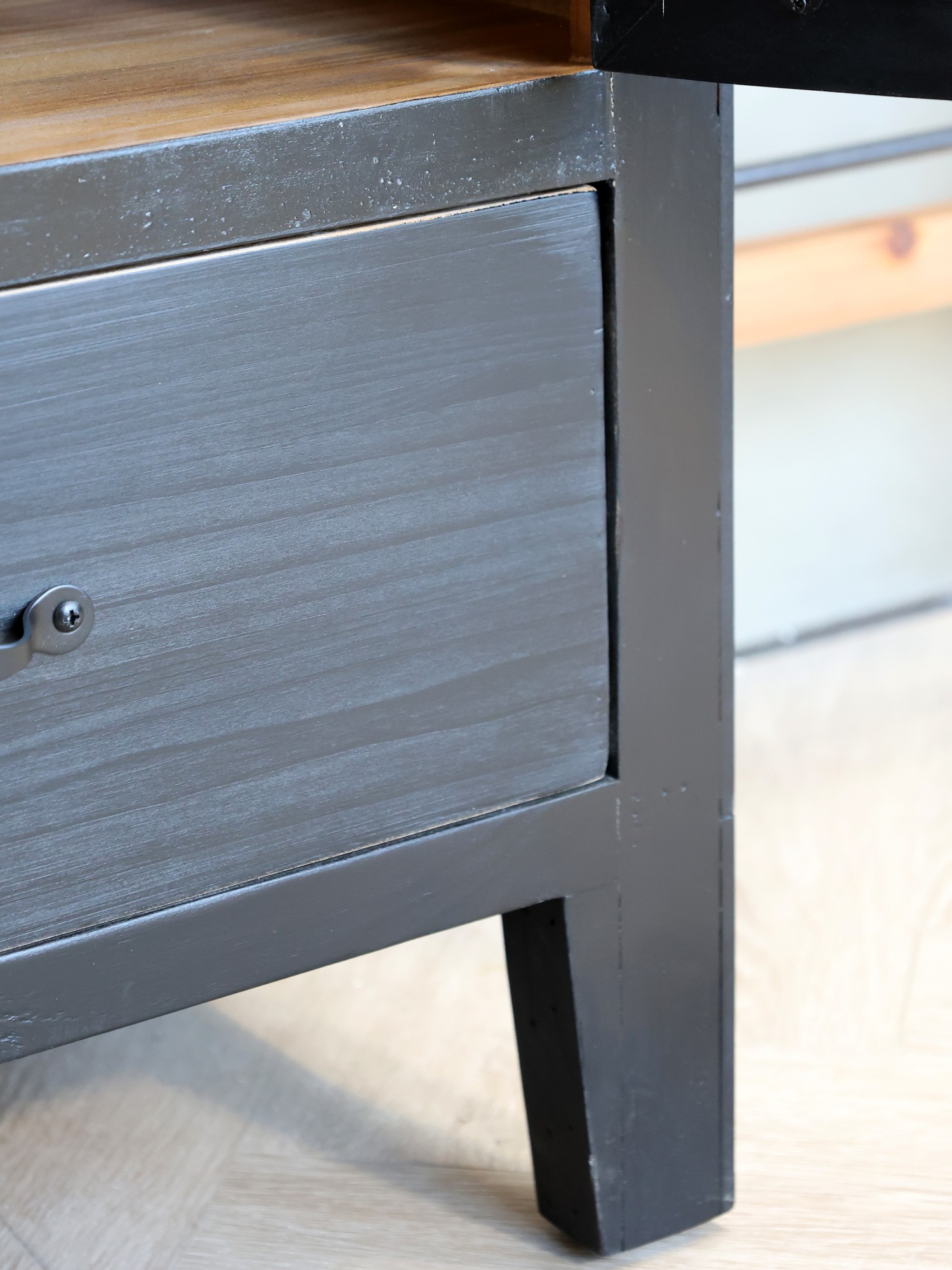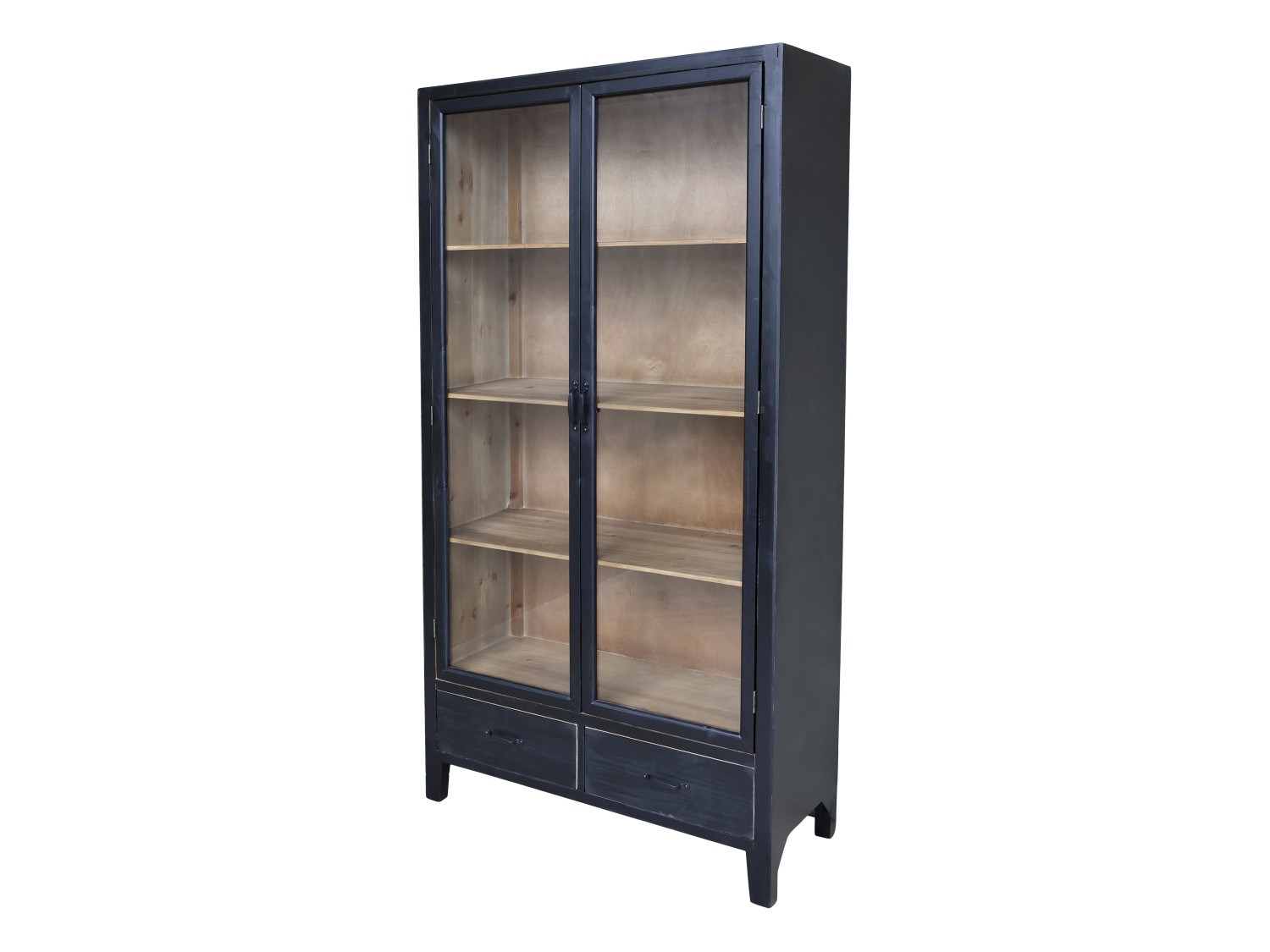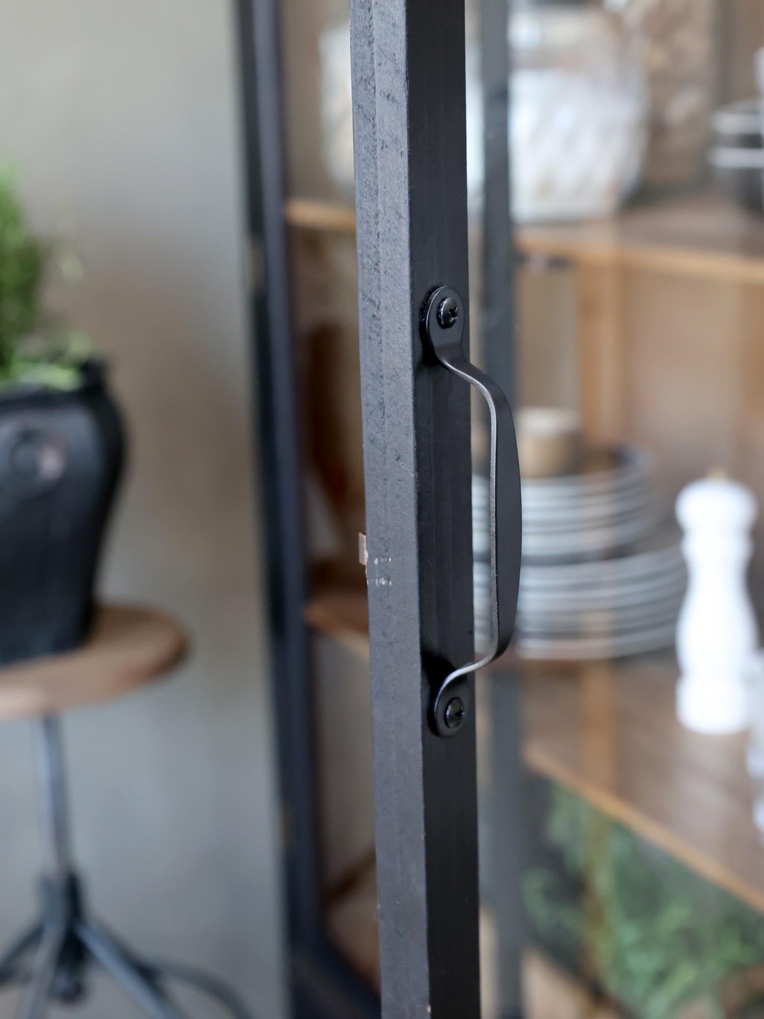 Allerdings hat die Vitrine durch ihre antike schwarze Farbe auch eine gewisse Kante. Im Inneren hat der Schrank seinen natürlichen Holzton behalten, was ihm Wärme verleiht.