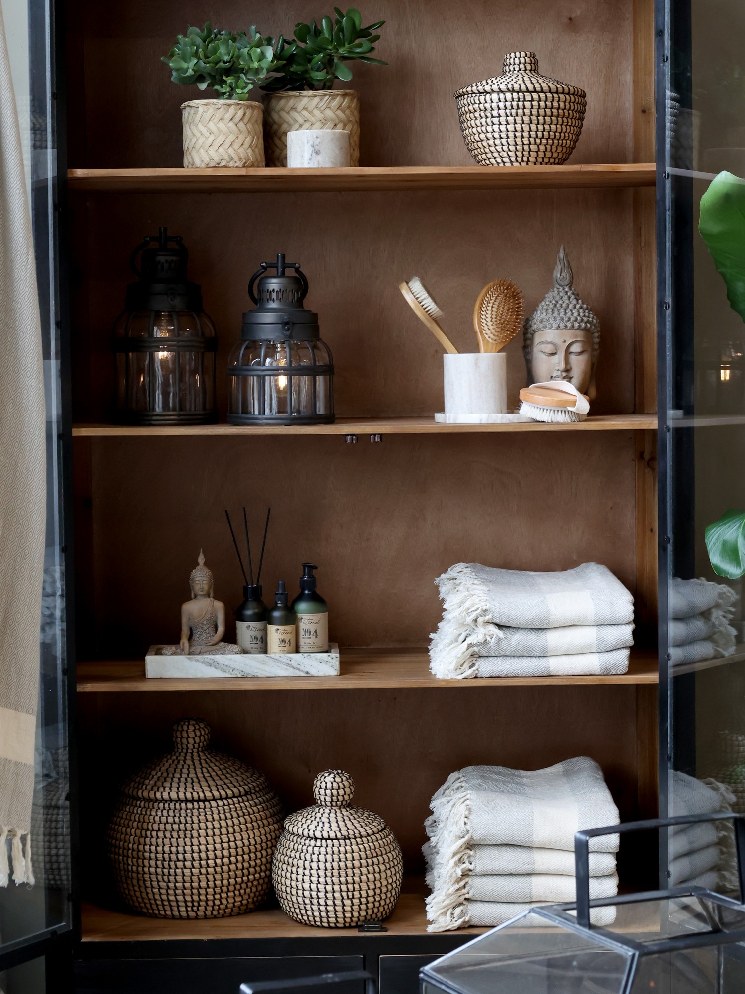Hinter den Glastüren finden Sie vier Regale, um Ihre Lieblingsgegenstände aufzubewahren und auszustellen, und darunter helfen Ihnen zwei praktische Schubladen, organisiert zu bleiben.