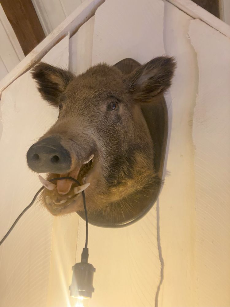 ...lass die Sau raus Wandleuchte " Willy " ist ein Original-Kopf! Der Kopf stammt vermutlich aus der Zeit um 1930. Es wurde lediglich dasKabel mit Schalter ergänzt. Das Lampenkabel ist 2 m lang und stoffummantelt. Die Lampenfassung (E27) ist aus Messing gefertigt. Die Lampe ist der HINGUCKER schlecht hin nicht nur in der Jagdhütte!
