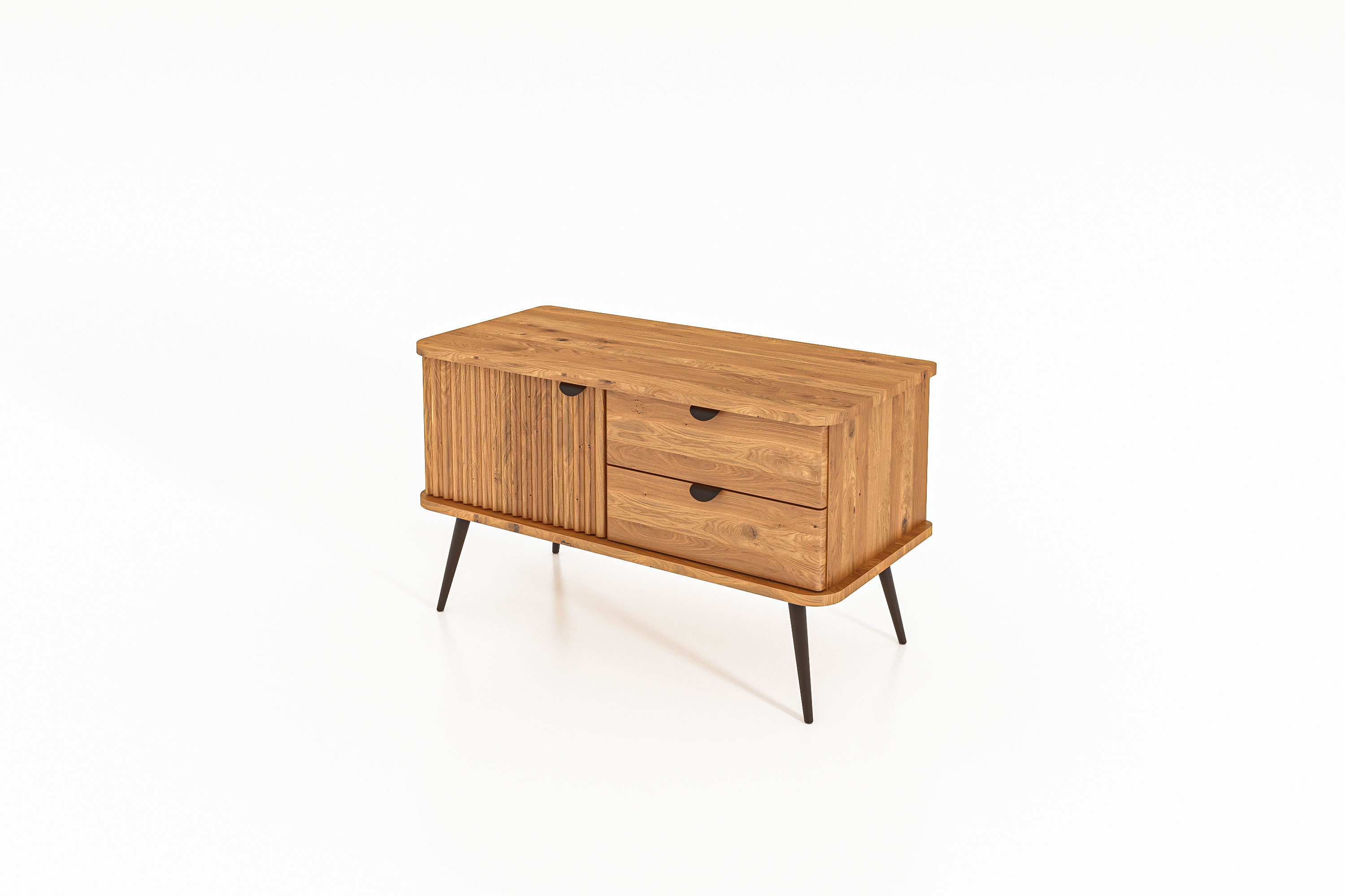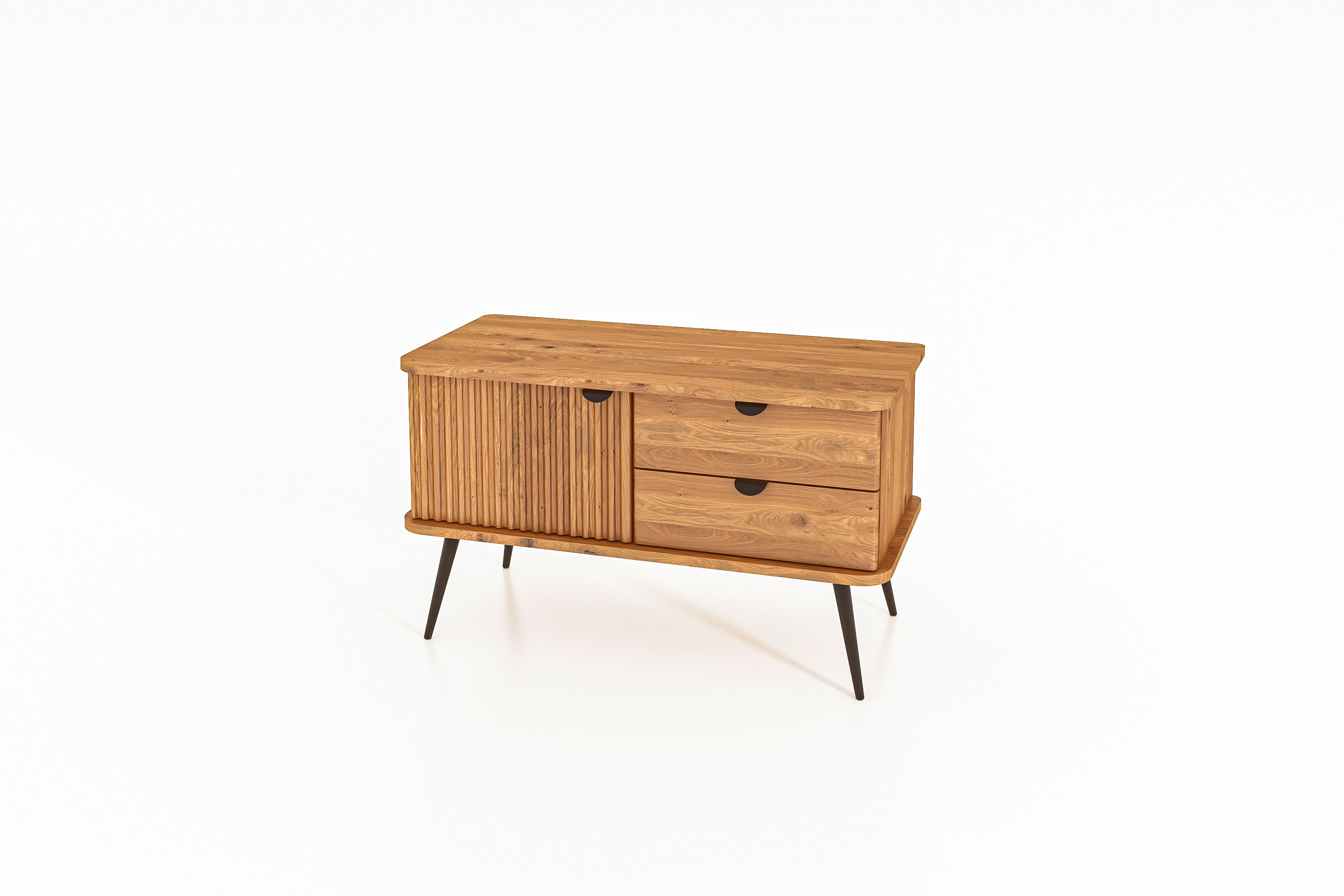 flaches Sideboard 1 Tür & 2 Schubladen / Kula 2808. Die Kollektion ist eine Möbelserie, die für Wohn und Schlafräume konzipiert wurde. Möbel aus der Kula-Serie spiegeln ein Lebensgefühl eines modernen Wohnstil wieder. Schlichter skandinavischer Look mit einem Hang zum Industriellen. An allen Möbelstücken finden Sie Möbelfüße und Möbelbeschläge aus Metall. Es ist die Mischung die es macht, warmes Holz und schwarzes Metall. Besonders; gerillte Holzflächen an den Türen, wunderschön! Maße: B-97 cm x T- 45 cm H - 57 cm. Diese Modell gibt es auch noch mit einer Breite von 144 cm.
